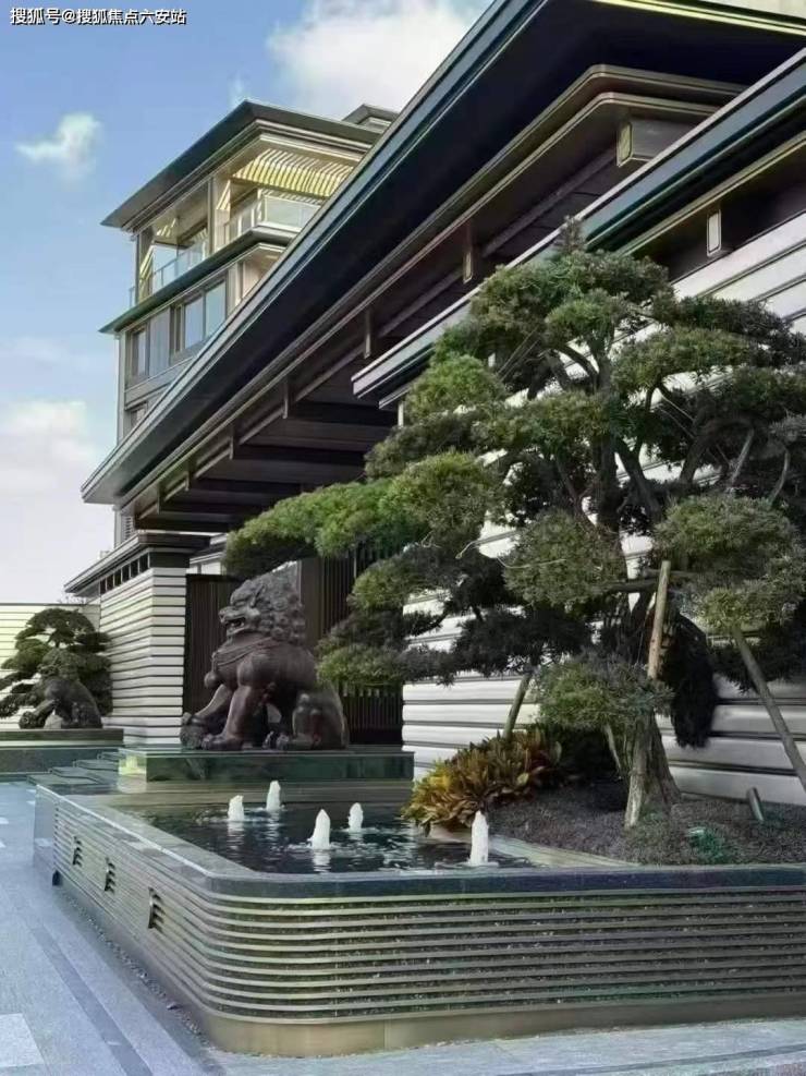 屋檐取形北京太和殿庑殿顶,融入良渚高台夯土文化,搭配铜狮、涌泉、五步青云阶,辅以琮黄色调装饰,营造归家非凡礼遇。