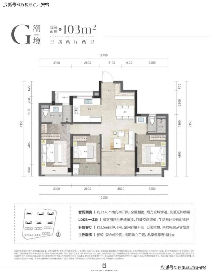 建面约103㎡的三房户型,四开间朝南,且南向面宽竟做到了约12.45米,阳光得以在全屋渗透。主卧预留的L型衣帽空间,让女主人一眼动心。