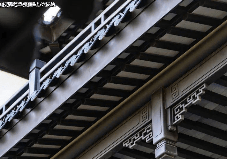 还有一些中式,一层的轩廊仅粉刷白顶,但首望澜翠府却做出了繁复的茶壶档轩,并装饰垂花柱、挂落。
