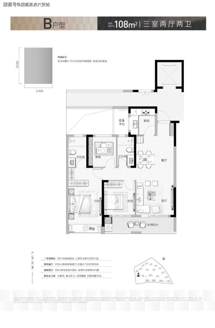 · 96㎡三房两卫:三开间朝南,6米南向阳台,U型厨房+餐客一体,主卧套房设计;