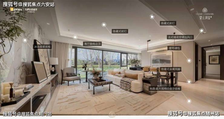 公区工艺:运用曲线、镂空、拼接等复杂工艺,地面岩板、吊顶、落地窗等六大公区界面整体通铺,杜绝卫生死角,营造“美术馆般纯净空间质感”;