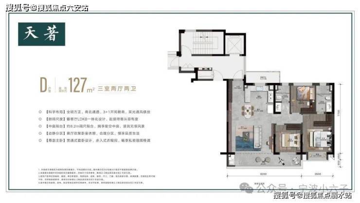 约127㎡瞰景高层:三室两厅两卫,LDKB一体化设计,南北通透,双阳台观景。