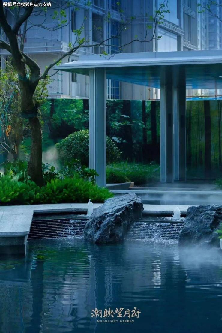 在社区整体规划方面:潮映望月府通过景观空间的差异化分配,创造出更大的核心景观空间,演绎出“大围合”的庞大中心园林尺度,并配合不规则水景、架空层的营造,塑造出极具度假质感与休闲气质的核心景观空间。