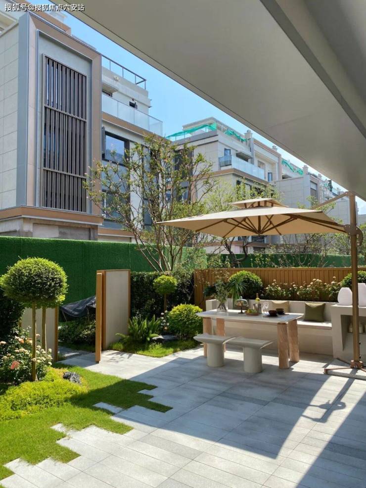看一眼外立面,白色石材、香槟色的木纹铝板、大面积玻璃的拼接组合,怎么看都不像一个门槛只有300万+的低密叠墅。