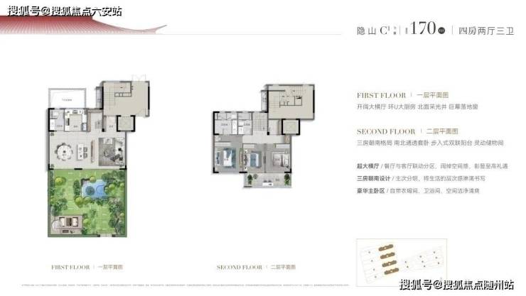 比如建面约170㎡的双层下叠四房两厅三卫,约9.7米面宽,三开间朝南的大四房格局。首层餐厅、客厅、品茶厅三个空间横向舒展,有机组合、互不干扰,单层就撑起了大平层的排场;窗外,还自带一个约9.7米宽的超大花园,满足各种野趣需求;二层是3个房间朝南,奢配约5.6米大阳台,两房联动,舒适自然。