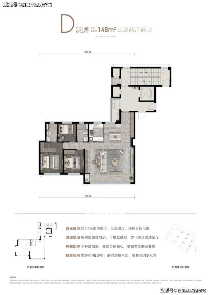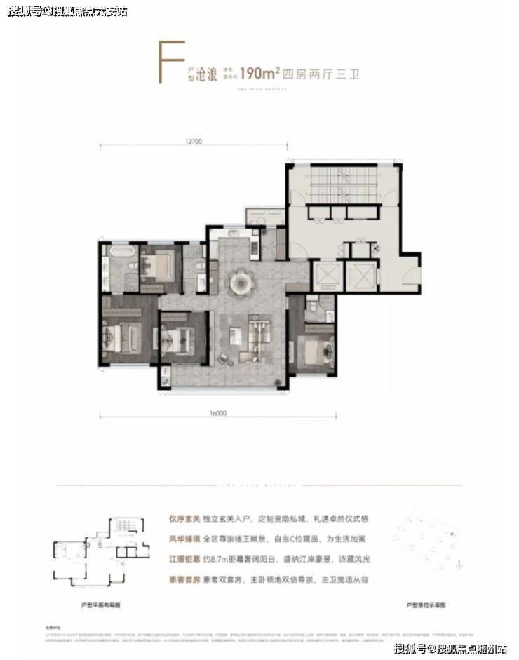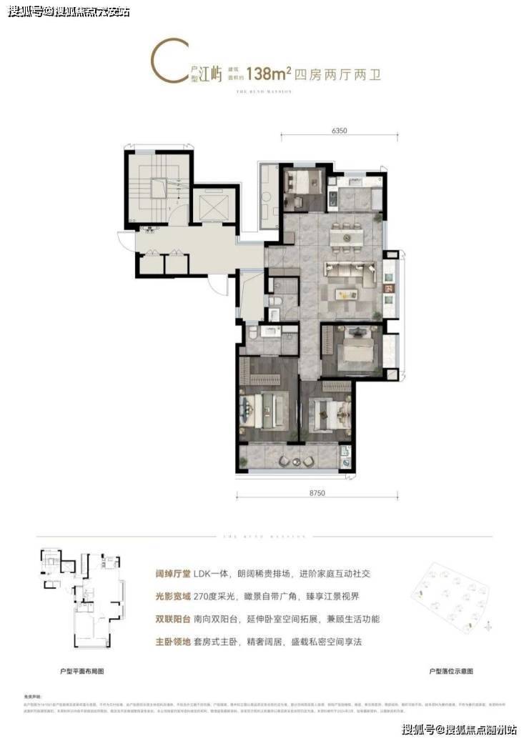 以江水波纹为设计灵感,精筑玻璃天幕立面,公建化立面,全封闭阳台,缀以优雅金属线条,顶部标志性塔冠造型,层层退台,为城市天际塑立时代地标,点睛江岸封面。