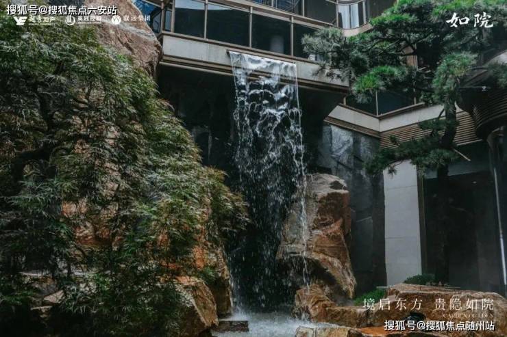 黑松迎宾,太行金石皮摹写山水肌理,开启松间画屏的宁静序章。斗拱、榫卯、拱门、丝织元素转译舒卷归堂的东方美学,穹顶之下,归家即享恢弘妙境。叠石、壑松、理水相映,约15米超尺叠瀑倾泻而下,以“银河叠水”奇观展现动态的《溪山行旅图》意境。下沉茶室静对流水,独拥“月映听泉”之幽。