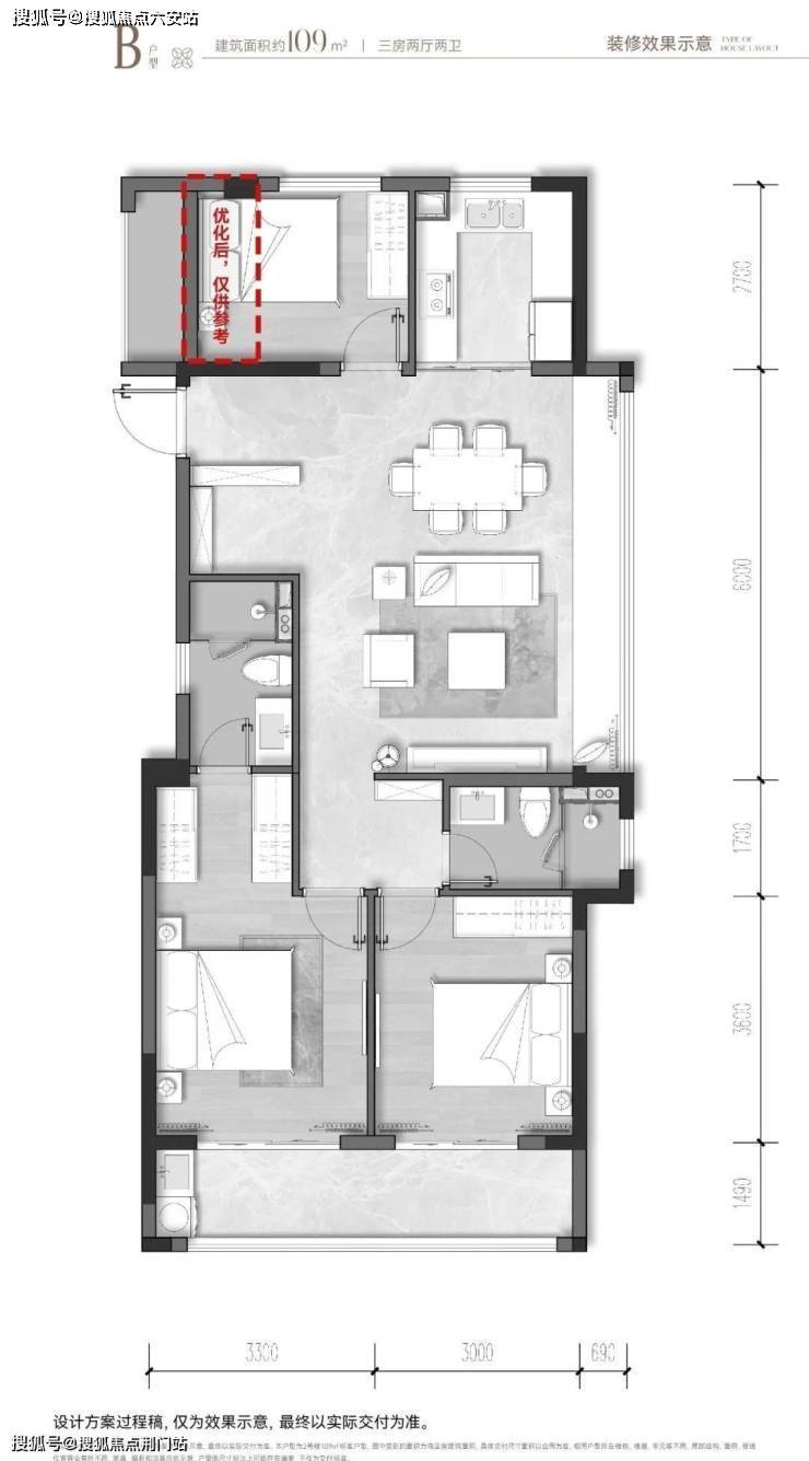 建面约109㎡三房两厅两卫户型。