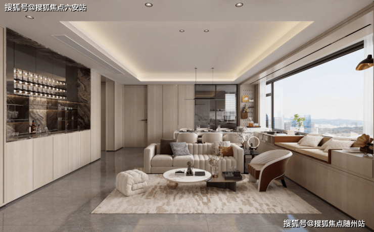 建筑采用铝板+三玻玻璃幕墙,以香槟金色调勾勒流线型轮廓。270°无柱转角飘窗消除视野阻隔,实现室内外景观无缝衔接。