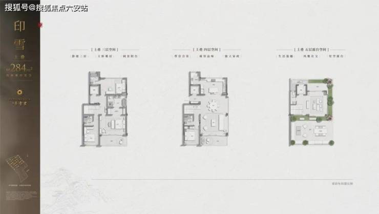 合院之中,中间套建面约296㎡,地上三层,四个卧室全部是朝南的套房,还是奢侈的双主卧配置,且每一间卧室都连接户外空间。