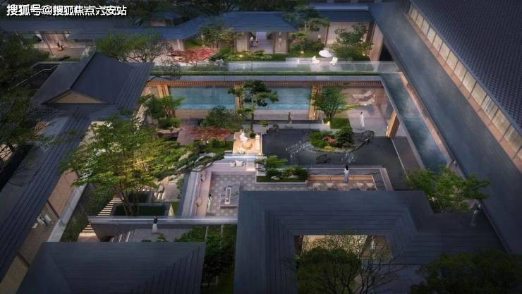 园林景观上,项目以“一轴一带八景十巷”为骨架,构建多进式园林体验。入口处对景墙以亚马逊绿奢石镶嵌金石,刻绘项目Logo与六瓣梅花图腾,形成一道视觉上令人赞叹的风景线。下沉庭院中,光影交织,潺潺流水映照婆娑树影,挺拔树姿注入向上生机,拉近建筑与自然的共鸣。镜面水庭倒映重檐飞角,与庭院景观相映成辉。