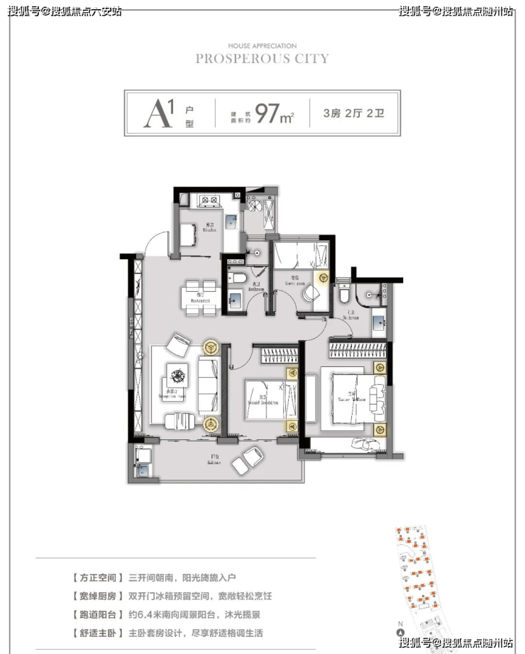 建面约97㎡三房两厅两卫中间套,面积不大,五脏俱全。最吸睛的是约6.4米的跑道式阳台,日常洗衣晾晒和休闲赏景都可以轻松实现。