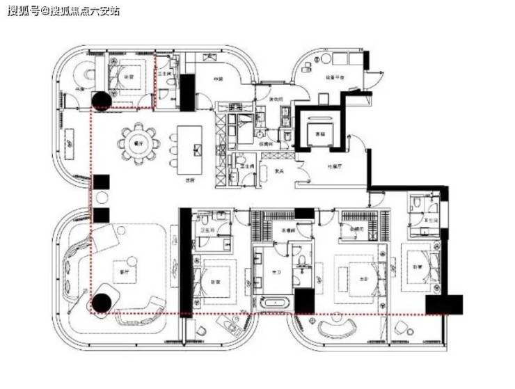 做了六房六卫,四套房,每个房间尺度都很阔绰。3.8米层高,24米南向开间,餐客厅近200m²