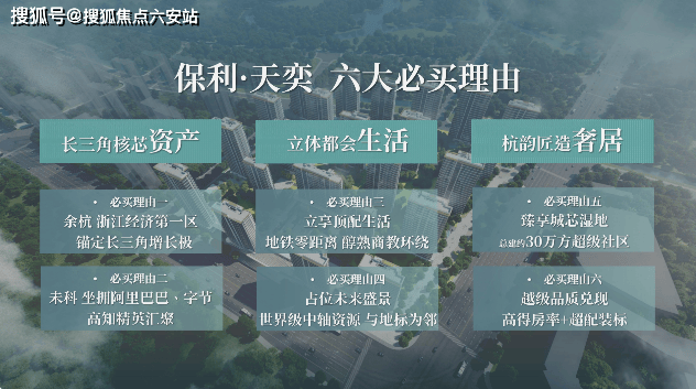 保利发展全国第三座“天奕”系高端标杆作品,落址杭州未来科技城南缘核心辐射区,打造“立体悬浮未来生活松弛岛”,集高端居住、生态景观、全维配套于一体的大型改善型社区,适配未来科技城科创精英及高端改善家庭需求。