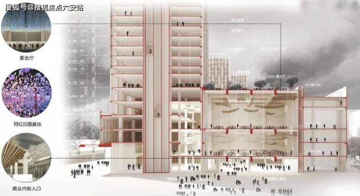 同进韵动城率先打破当今“产业功能一团散沙”、“专业协同单兵作战”、“工作生活极度割裂”的网红产业痛点,引入超高无柱摄影棚、形成专业拍摄平台集群,打造网红产业生活共同体。综合体1层局部架空形成网红商业街区,2层打造大空间拍摄基地,3层为宴会厅,4-19层为网红产业办公,20-23层为高端酒店,顶层打造企业会所。通过网红潮玩、特色餐饮、休闲娱乐、酒店、办公等多种业态的积聚,满足潮人可以一边为了未来愿景专心工作,一边好好享受当下的理想生活愿景。