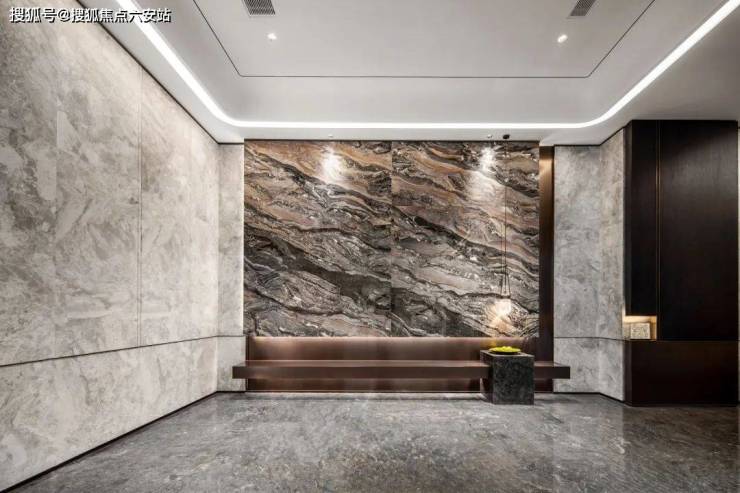 似乎想要把品质感“武装到牙齿”,地上地下双入户大堂内部的墙面摈弃了传统的涂料,大面积采用了明亮且纹理丰富的灰色石材,搭配独特纹理的威尼斯棕石材,全方位营造出尊贵典雅的空间氛围。