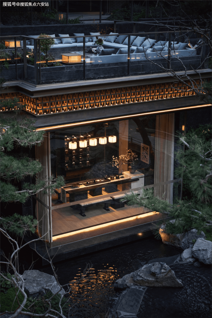 项目立面采用香槟金铝板+蓝眼睛石材干挂,北立面更用四种色调铝板拼接,融合歇山重檐、纳福悬鱼等宋式元素——既保留了传统建筑的韵味,又通过现代工艺解决了“石材脱落”“铝板褪色”的问题。无论是远观还是近看,都像一件“可以住的艺术品”。
