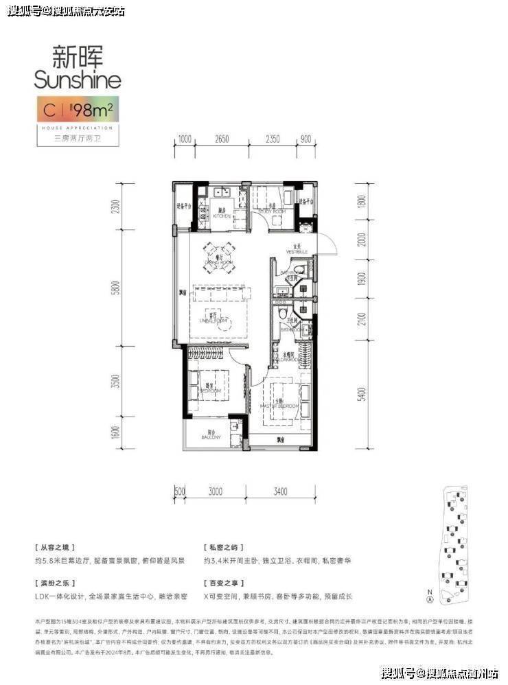 270度环绕式采光,视野绝佳;主卧独立卫浴、走入式衣帽间、南向阳光飘窗,享优雅随心的寝居感受;阔约5.9米带飘窗的边厅,与带大开窗的厨房无界联通,加上独立玄关,4房功能齐备。