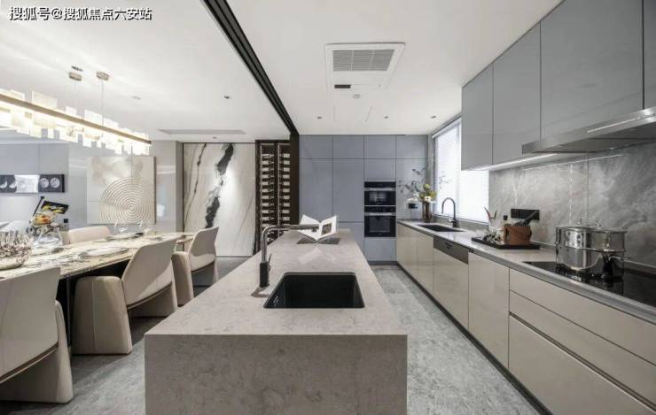 而在餐厅处,精心挑选整面熊猫白奢石,增添整体色彩的多样性,雅奢中不失灵动;厨房中西厨岛台设计,并在中岛处配置自动升降插座,大U型动线,功能非常强大;冰箱、洗碗机、烤箱、蒸箱等一线德国米勒品牌,让每一次烹饪,都极具品味和优雅。