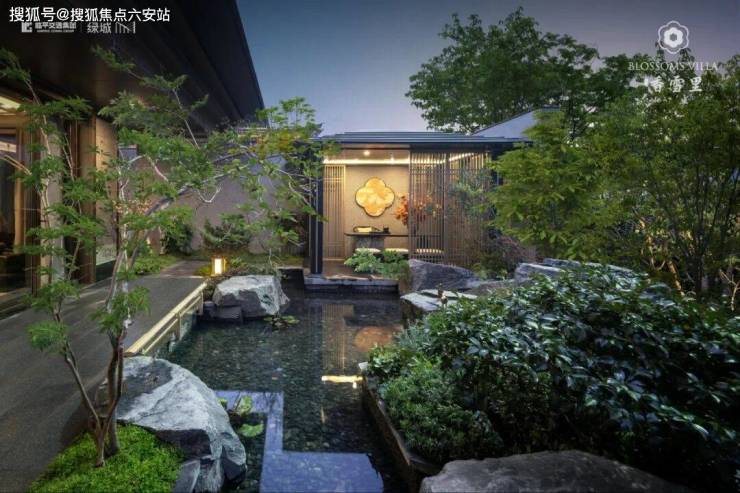 一扇门,门外是喧嚣,门内是静雅。跨过大门,只见梅花树矗立中央,搭配高低错落的黑松树和山石,树下潺潺的水镜,映衬着落梅图案纹理,形成一幅寒梅山涧盛放的山水画卷