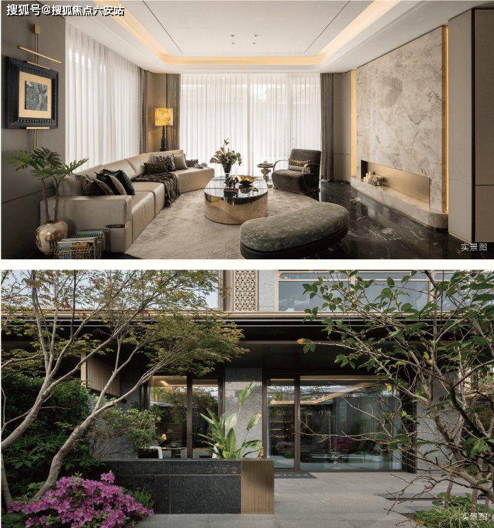 配色和用材都很奢雅,你看大面积景墙是由亚马逊绿奢石打造的,中间金石镶嵌着项目Logo,刻着香雪里的名字,还有超山独有的六瓣梅的图腾,在视觉上就非常惊艳。