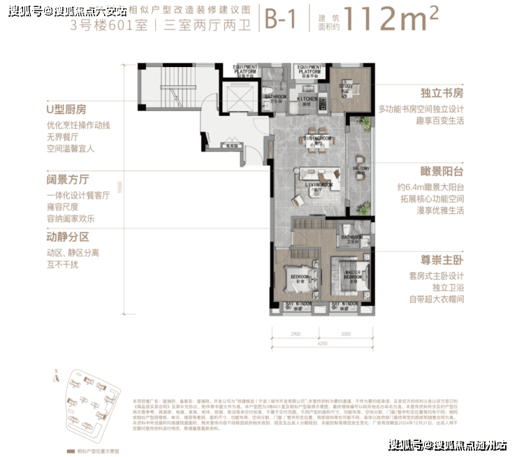 • **98㎡三房两卫**:创新LDKB一体化设计,6.4米双联阳台实现“家政+观景”功能分区,主卧套房配置270°观景飘窗,得房率高达82%;