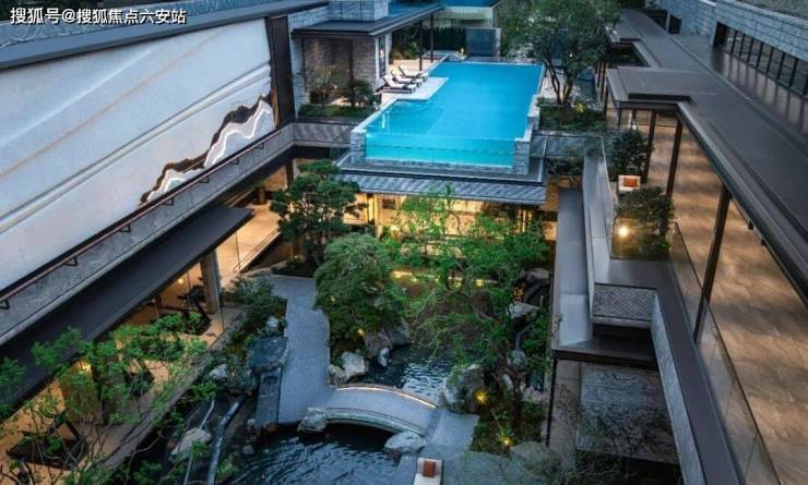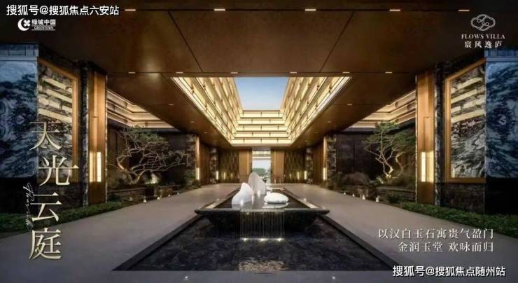 项目以约150米中央水轴贯穿东西,融合“四水归堂”传统理念,串联“十八学士下沉庭院”“银河九天瀑布泳池”等节点。入口“九五登峰”门庭高约9.5米,以巴西铂金钻奢石、六棵百年黑松营造“紫气东来”的归家礼序;下沉庭院复刻南宋夏圭《溪山清远图》,以十八学士山茶花沿涧种植,形成“涧水鸣珮,山茶照影”的东方长卷。