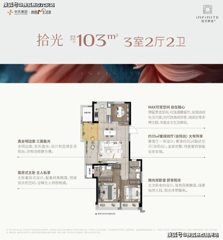 建面约103㎡的边套更是堪称神迹,将小户型的空间魔法玩到了极致。客厅到阳台的地面、天花直接拉通,甚至两侧的墙垛都已隐身,整个餐客厅面积达到约35㎡(含阳台),这可是140㎡以上大宅才有的空间感!