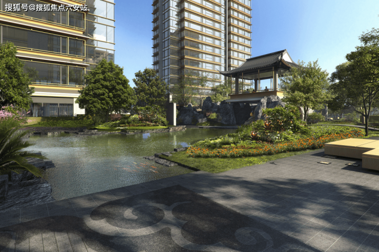 ”约930㎡礼仪园,表达“入园以礼相迎”之意,对称设计,罗汉松、卧石组成“两松定石”之境,将“石冠群山”、“砚国明珠”的歙砚造型居其中,给予业主生活无限的仪式感与尊贵感。