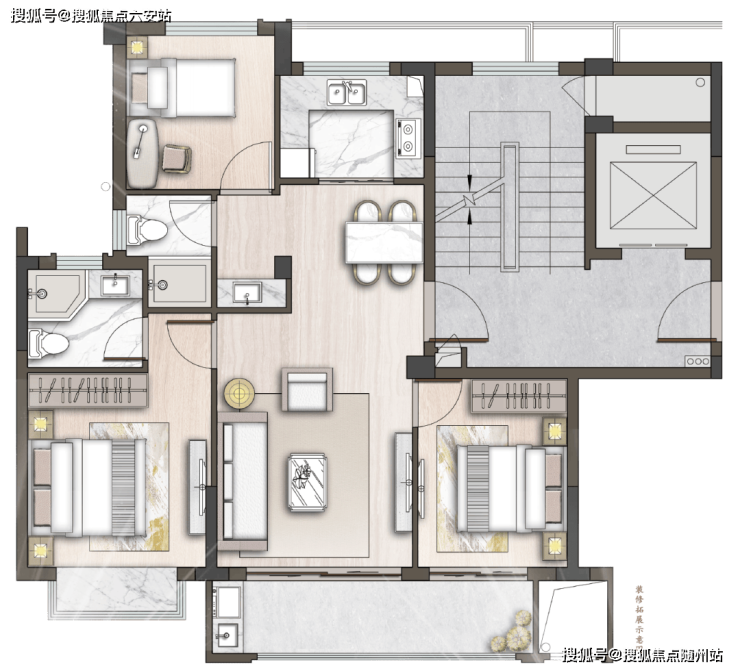 以建面约166㎡三层花园别墅为例,整个空间以5房2厅4卫布局,让别墅的空间可以不同家庭的需求,也让三代人都能享有独立私密的休憩空间。