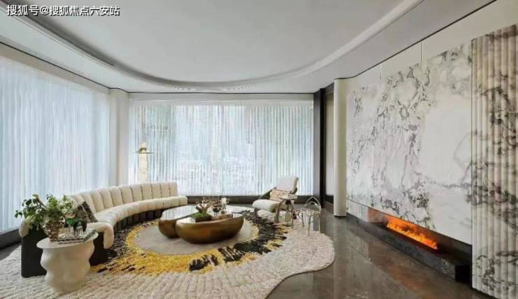 博385m²的钻石厅,是去年的产品,沿用了梅西家同款的FENDI白大理石做了一道圆弧形背景墙,转角是工艺复杂的波浪纹,不仅造型独特,而且损耗极高,配合火红的壁炉、米白的钢琴键沙发,别致的水滴形吊顶与弧形PRADA绿奢石岛台交相呼应,升华了艺术氛围。