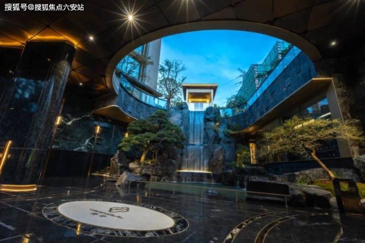 社区园林“九相”意境:入口施华洛世奇“金韵云光”雕塑(8.2万颗水晶+4.3万片金箔手工缀合),600吨中国黑原石叠筑7米飞瀑,300年黑松、鸡爪槭、乌桕名贵绿植错落,光影水声交织成画;