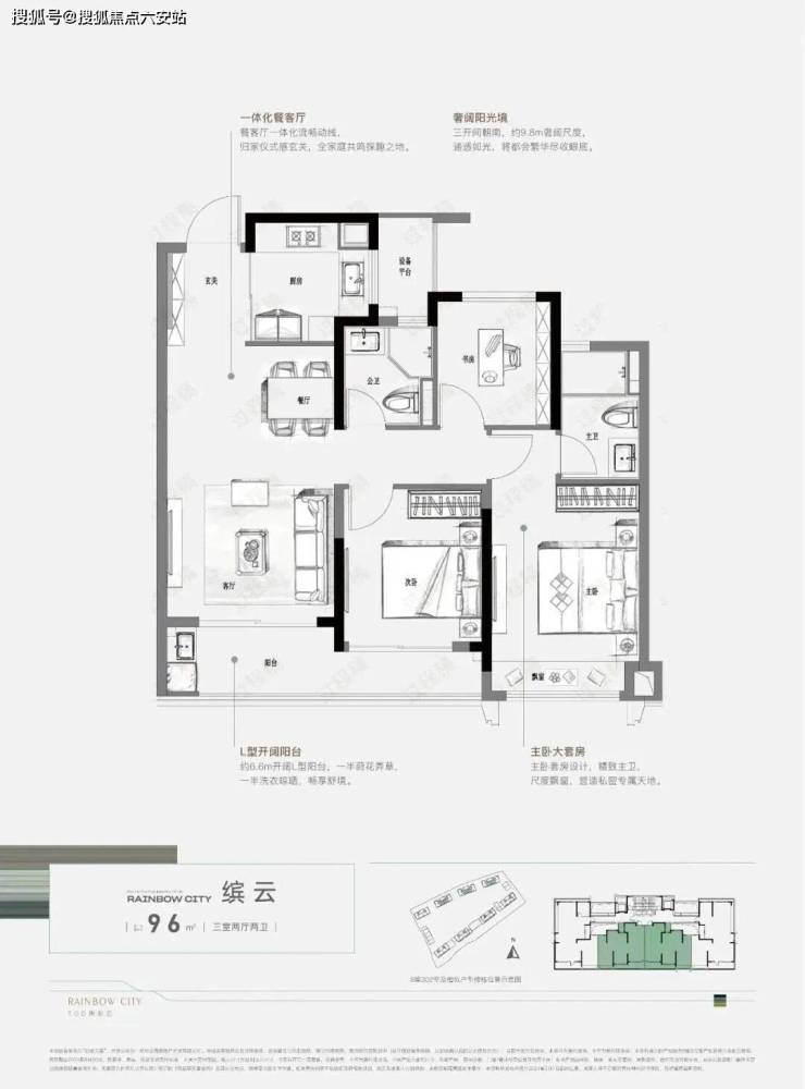 约96㎡户型:三开间朝南,配备约6.6米L型阳台,采光通风良好 。