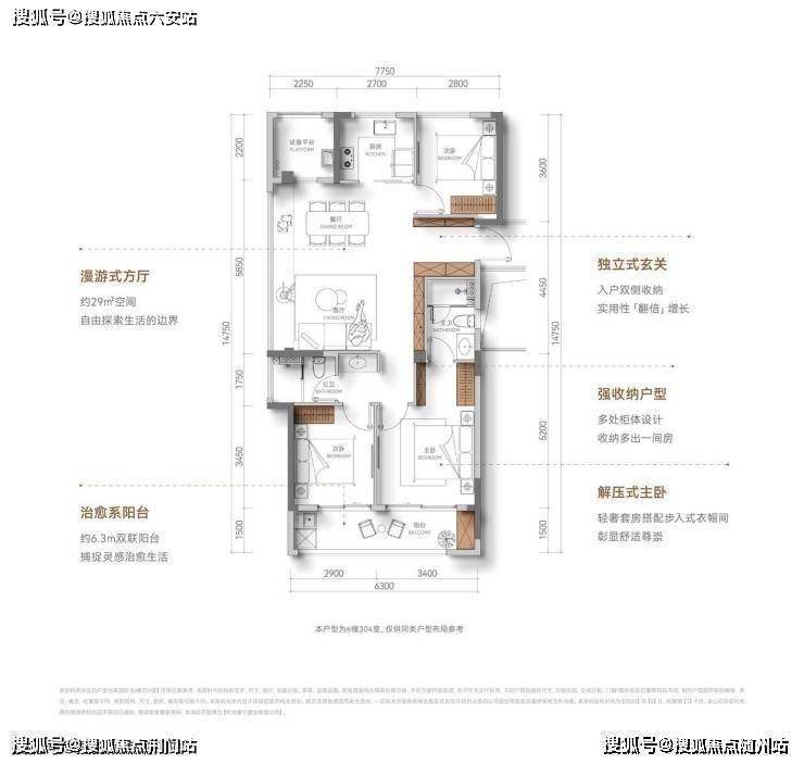 约110平方米三房两厅两卫户型为边厅设计,拥有约29平方米的漫游式方厅和6.3米跑道式阳台,三面采光。独立玄关设计,双侧收纳空间,预留双开门冰箱位,实用性倍增。