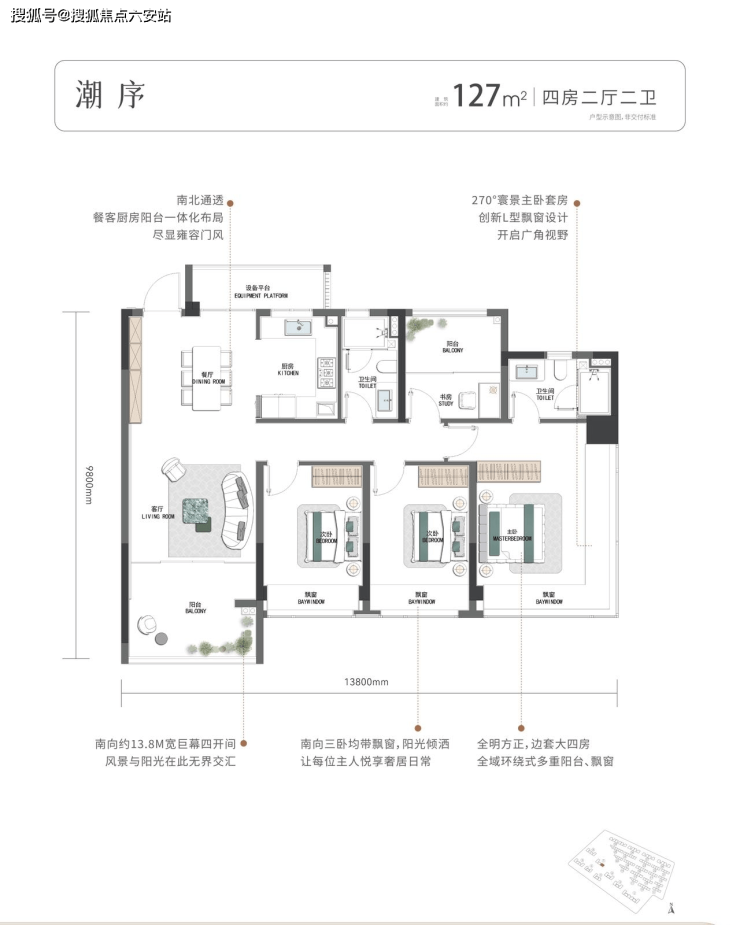 揽景小高层建筑面积约105-130㎡,为最大化景观面,突破性设计建筑面积约105㎡南向四开间。