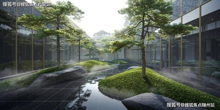 项目的主入口和下沉式庭院,同样是一幅充满人文魅力的景观画卷。山水叠石,黑松,鱼池,飞瀑,寓意十全十美的十扇屏风窗和屋顶的金线葫芦,将传统人居的吉祥美好悉数呈现。