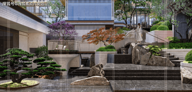 项目大门以"大夫之堂"五级台基为序,50米宽的整体界面如展开的《韩熙载夜宴图》屏风。33米规制的门庭两侧,四片奢石景墙采用"四水归堂"的对称布局,跌水声潺潺中暗合"水为财"的古老智慧。这种归家仪式感,在当代语境下被赋予新的解读——不仅是物理空间的转换,更是从城市喧嚣到心灵栖居的精神过渡。
