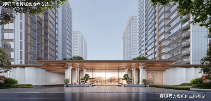 66米酒店式大门以“曲水流觞”为灵感,选用维多利亚白花岗岩。建筑顶部以圆弧转角工艺形成“云冠”造型,公区采用拼花石材、皮革硬包等高端材质。