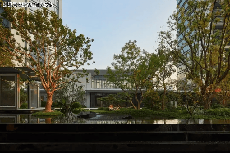 原生围合布局:10幢公建化建筑以45°倾角错落排布,形成约1.4万方中央花园,融合下沉庭院、主题架空层及全龄活动区,打造“江潮绿洲”立体度假园林。