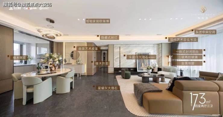 内部装标配置更让你眼前一亮:餐客厅地面和电视背景墙为大理石交付,更有甚者,室内总共用到5款石材,墙面用尼斯木饰面取代以往的墙纸;厨房空调+博世六件套(含双台冰箱),东芝的中央空调,唯宝台盆、汉斯格雅五金、松下智能马桶、智能家居欧瑞博.....很多配置在云城,尚属首次!