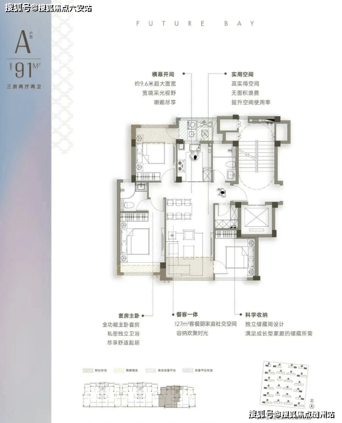 以建面约91㎡户型为例,该项目做到了三房两卫带储藏间,南向开间近10米,LDK一体化设计达到约27㎡,形成宽敞的家庭社交空间。即使是小户型,也实现了正三房、套房式主卧的全功能配置。