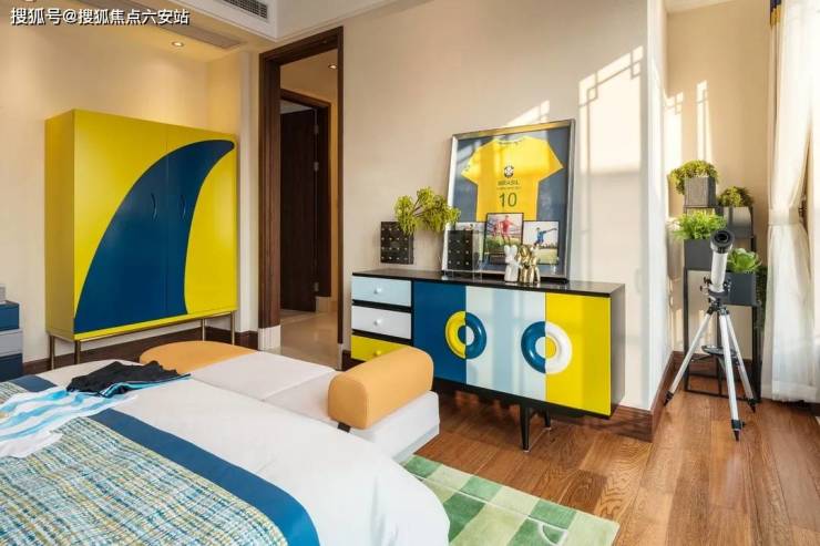 考虑到孩子应有的俏皮与活动,整个空间运用黄色与蓝色为主色调。带来个性又鲜明的视觉效果 。 细节设计同样充满了运动风格艺术色彩,地毯的造型,以装饰画、玩偶的摆放,也为空间增加了适用性和趣味性。太阳通过落地窗倾巢而入,孩子可以在这样的通透舒适的空间创作、感受。同时也起到培养热爱运动锻炼的效果。