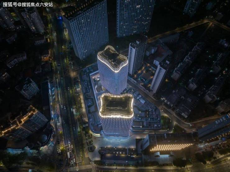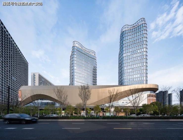 金属平纹屏凸显了塔楼顶部,这个金属屏形成的双曲塔冠,延续了塔楼的整体语言。塔冠的折叠造型使两座塔楼在杭州的天际线上形成独特的剪影。塔楼底部采用锥形造型,使其能够穿过商业裙楼,打造生长挺拔的造型。