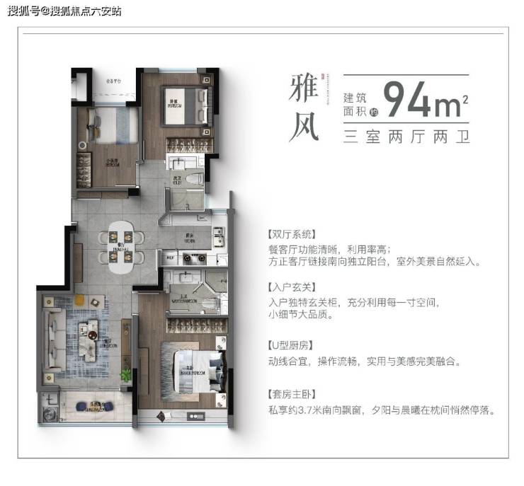 三室全明设计:U型厨房操作流线高效,干湿分离卫浴空间。