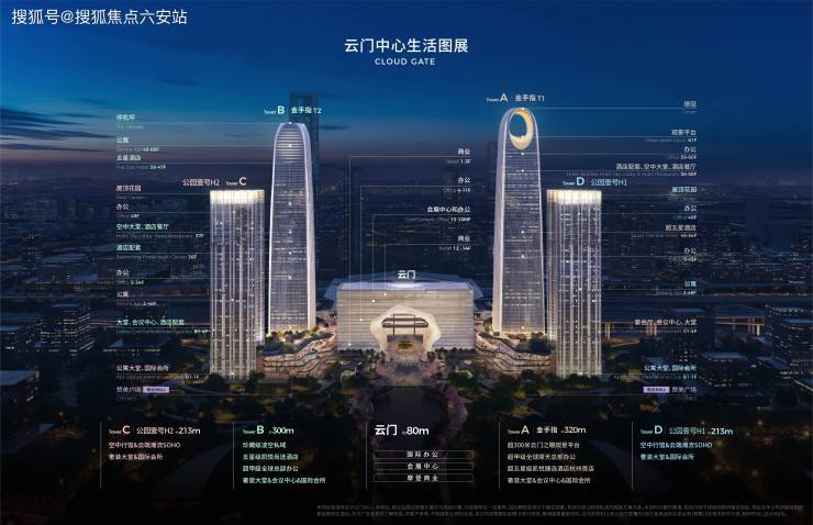 设计:由SOM事务所操刀,A塔“金手指”造型与程泰宁院士设计的云门建筑群形成“方中带圆”的玉琮意象,双曲面玻璃幕墙还原云瀑流动感。