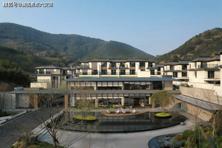 项目以《千里江山图》为灵感蓝本,采用歇山顶、格栅窗、竹纹景墙等宋式元素,搭配蓝眼睛石材与铝板幕墙,形成“新宋风”建筑语言。每栋合院均享**退台式立体庭院**,最高达12米的垂直绿化让建筑隐于山林。