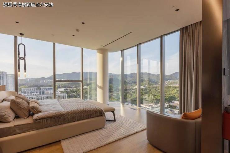 三面超白玻幕墙设计,270°环景视野,约17米巨幕面宽将四季山岚引入室内,70㎡无梁大板客厅与松涛声共鸣。- **复合功能**:首创“办公会客+宴会休憩”复合模式,东边套四房三卫双主卧,西边套四房四卫三朝南套房,空中酒廊与中西双厨满足商务与生活平衡。
