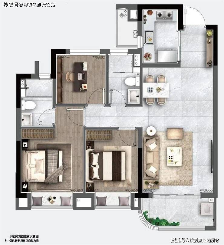 不仅如此,这个户型还将南向超广角环形阳台“接”在了主卧旁,未来业主完全可以将阳台包进卧室内,也便是将奢侈的一线江景生活拥入了怀中。