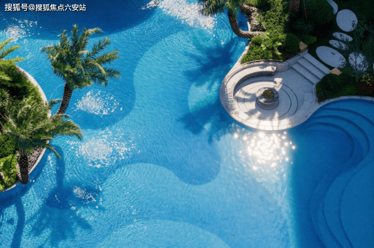 穿门而入,迎宾水院的风景很美,曲径通幽,步移景异。更亮眼的还有异形“蓝宝石”戏水池。
