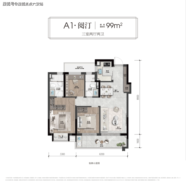 建筑面积约99m²神户型南向三开间引光入室,U型厨房高效分区,双联阳台延伸生活情趣;套房式主卧预留衣帽间,小空间实现“卧室+收纳+私密”全维功能,堪称“刚需天花板”。
